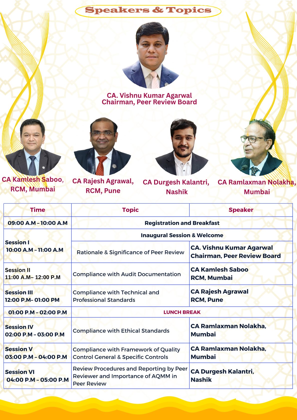 | Review Procedures and Reporting by Peer Reviewer and Importance of AQMM in Peer Review | CA Durgesh Kalantri, Nashik | 04:00 PM to 05:00 PM | N/A | N/A |
