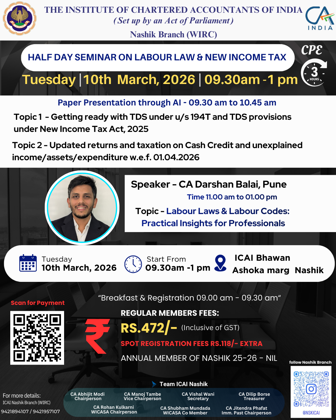 | Labour Laws & Labour Codes: Practical Insights for Professionals | CA Darshan Balai, Pune | 11:00 AM to 01:00 PM |