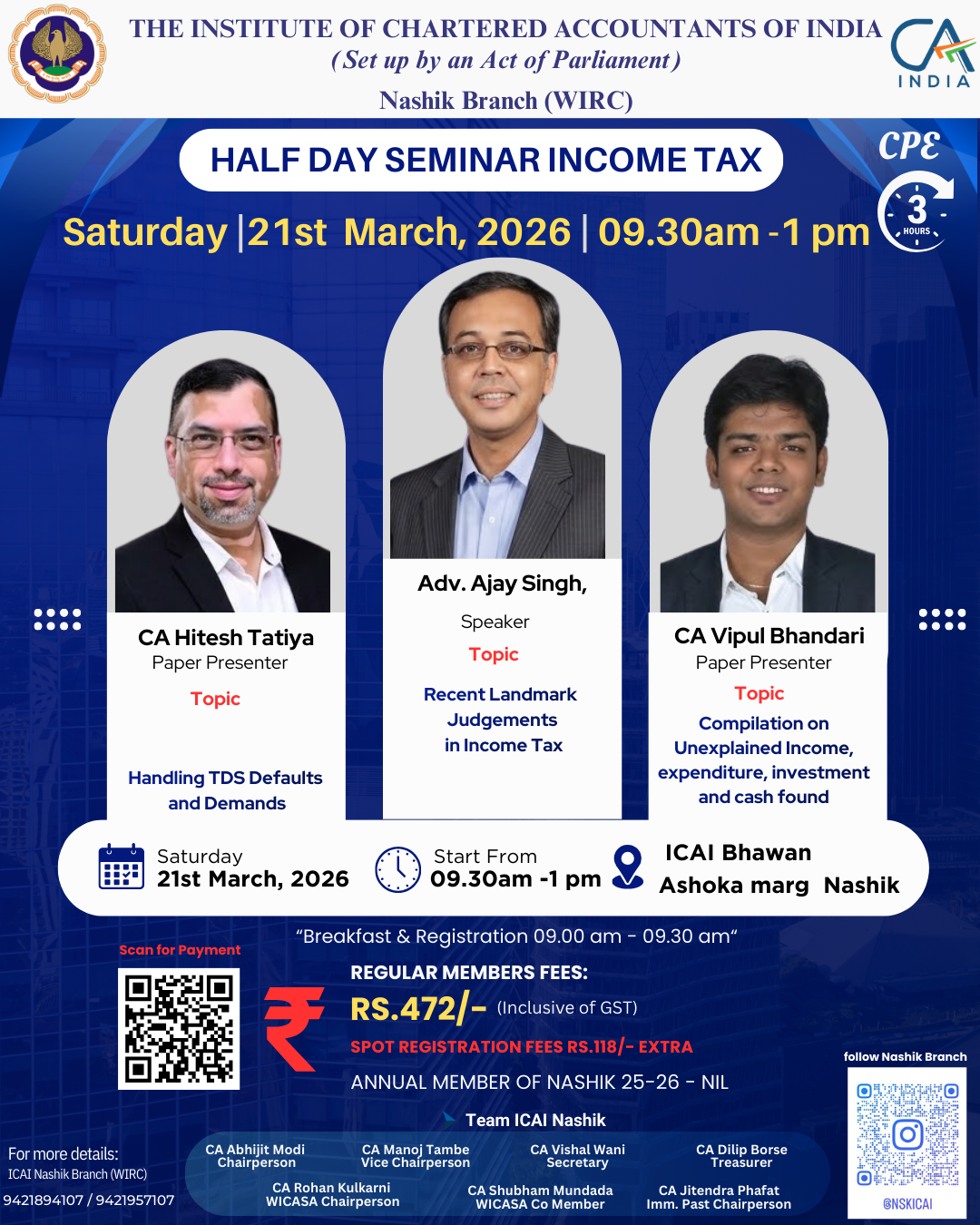 | Recent Landmark Judgements in Income Tax | Adv. Ajay Singh, - Speaker | 10:30 AM to 01:00 PM |