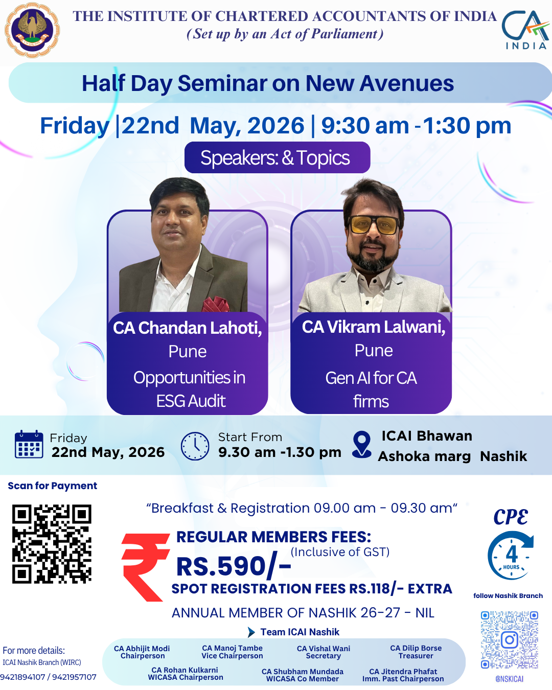 located at "ICAI Bhawan”, Plot No. 4/5, Ashoka Marg, Nr. Ashoka School, Pakhal Road, Nashik-422006. CPE Hours: 4 |